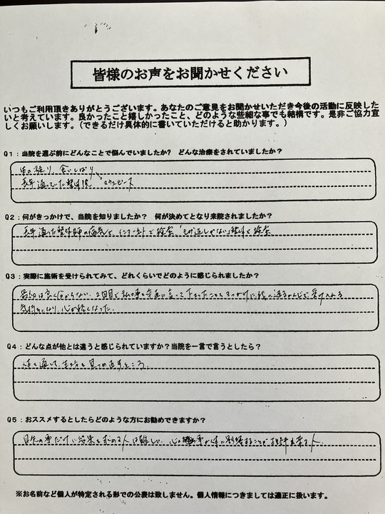 感想をありがとうございました。当初は、頸椎ヘルニアからくる、腕のしびれなどが、一日中、続いていたので、本当に大変でしたよね。この状態の中で、よく仕事も休まず、家事も続けられたと思います。