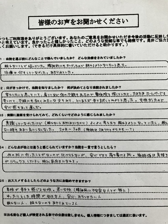 眠れないことで悩んでいた。精神的にもきつかったので、眠れるようになりたいと思った。治療は何もしていなかった。あきらめていた。