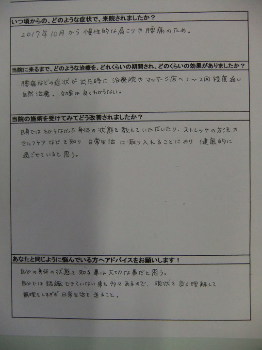 初日は、施術直後に痛みが出たが、回数は少なくなり、通院ごとに、体が軽くなっています。