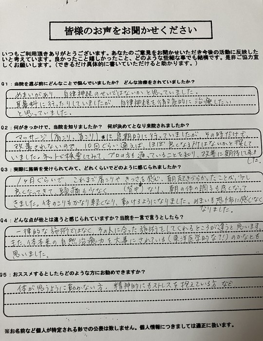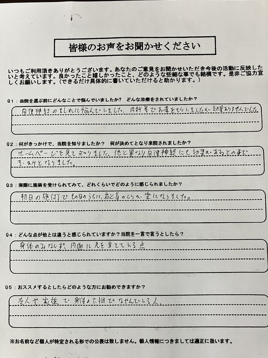 ウェブサイトで自律神経の病気を調べていたら出てきました。自律神経をコントロールする事が出来る気がしたから来院しました。