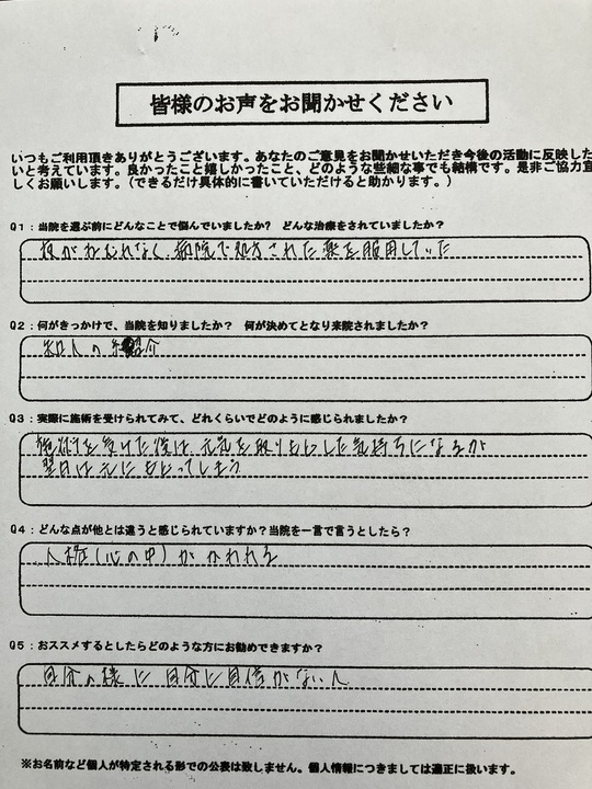 何をしていても不安になったり、人間関係に悩んだりしていてモヤモヤしていた。治療はマッサージに行ったり自然治癒院などに行っていました。