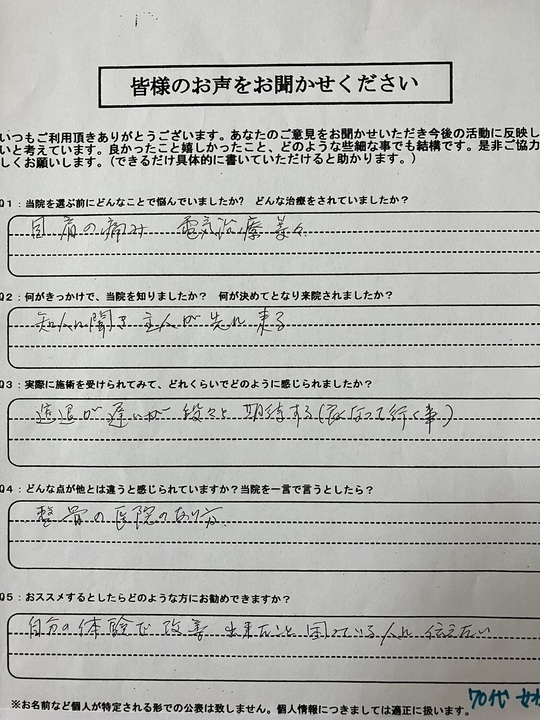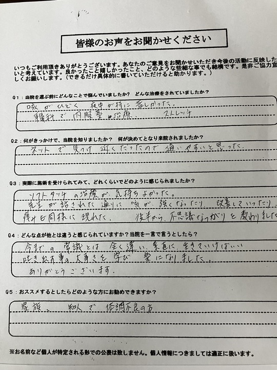 ネットの検索でたまたま見つけました。他の治療院とは違う”痛みのない整体”という事で、何となく奥が深そうだなと思って来院しました。