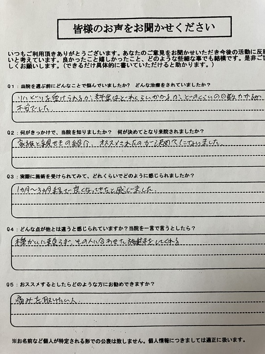 初めは、本当に大変でしたよね。歩くのも動くだけでも痛いのは辛いものだと思います。ですが、セルフケアや、注意事項もきちんと守ってくださったので、比較的、早い改善をされ、私も嬉しく思っています。