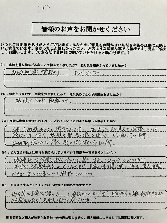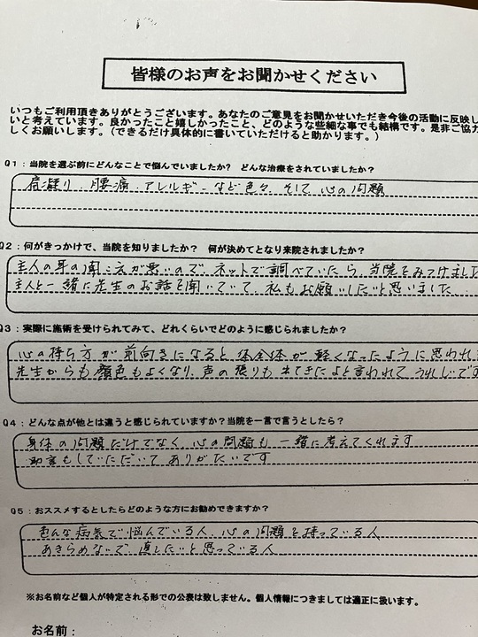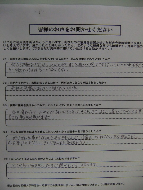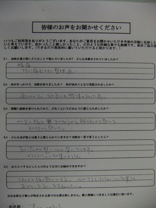 自分を見ていく情熱は素晴らしいものがあります。これからも、もっともっと楽になる様にサポートいたします。何でもご相談ください。ではまた、道中、お気をつけてご来院ください。