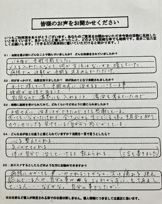 ですが、素直に内容を受け入れて下さったり、ケアも実践されてきたので、早くに改善されたのだと思います。